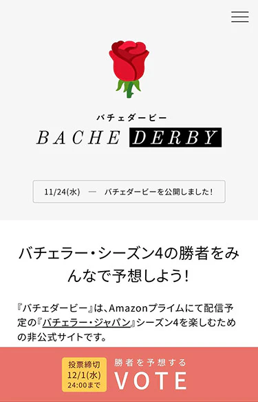 バチェダービーは、Amazonプライムにて配信予定の『バチェラー・ジャパン』シーズン4を楽しむための非公式サイトです。