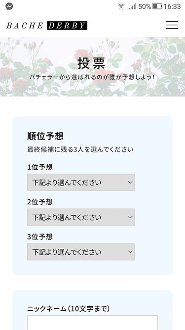 楽しみ方としては、この婚活サバイバル番組の中で「バチェラーが最後に選ぶのは誰なのか」を視聴者のみなさんに考えて投票してもらい、放送終了後にそれを採点して上位者を発表するという流れになっています。
